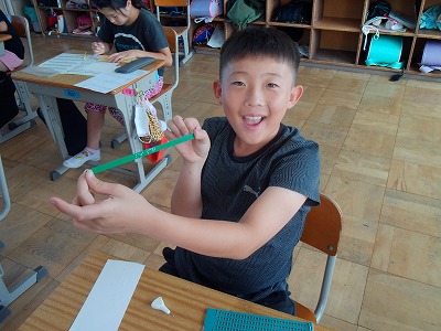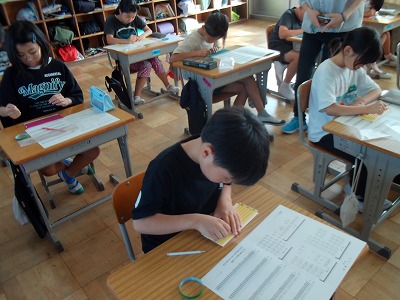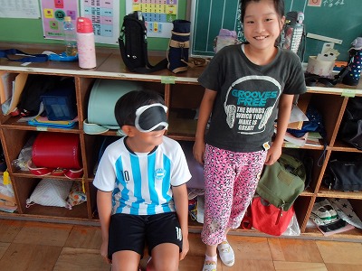 今日は、点字や目の不自由な人のくらしや気持ちについて学習しました。点字で自分の名前を打ったり、アイマスクをつけた友達をイスに座らせたり、食事のメニューを紹介したりしました。子どもたちは、「難しい」と言いながらも、一生懸命活動に取り組んでいました。最後の質疑応答にも、気になることをたくさん質問することができました。