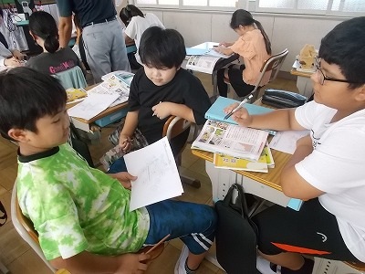 5年生は社会科で、「日本の食料生産を発展させるためには」について考えました。まずは自分一人、次に友達と一緒に考えています。違う考えを聞いて、自分の考えも広がっていきますね。