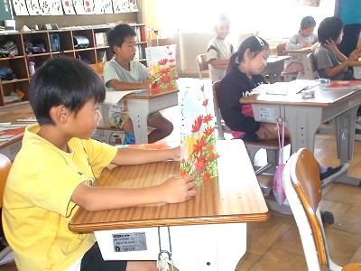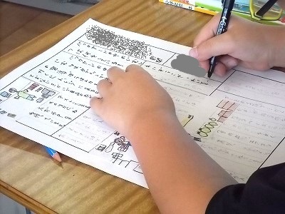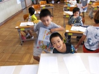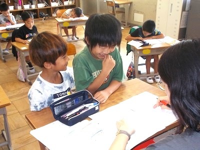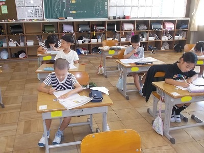 1年生は算数で、計算の練習問題を解いています。5枚ものプリントが待ち構えていましたが、みんな笑顔で取り組んでいます。やる気まんまんの子どもたちです。