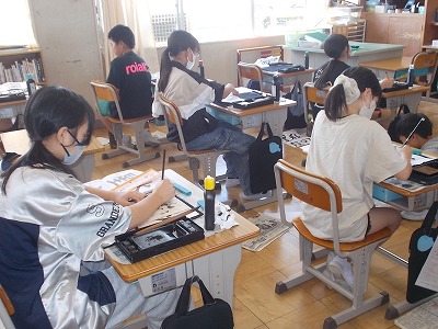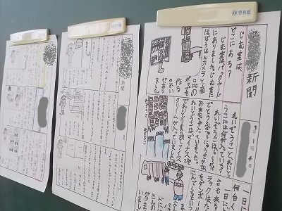 3年生は社会科で、先日見学したスーパーマーケットについて新聞にまとめています。写真やイラストを使って、わかりやすくまとめていますね。