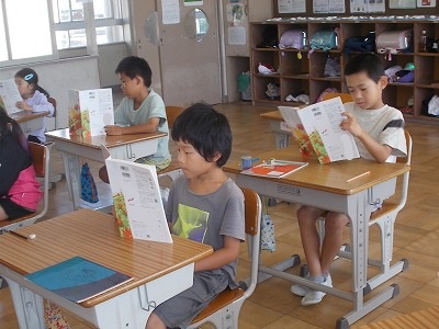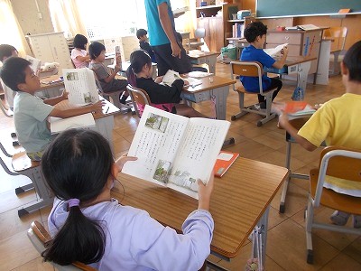 2年生は国語の授業です。教科書をみんなで順番に朗読していました。教科書を手に持って、姿勢を正して読んでいます。