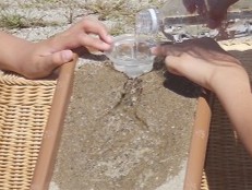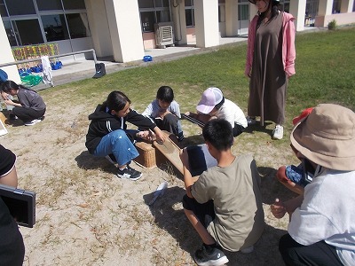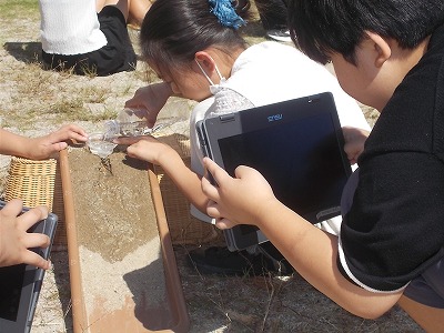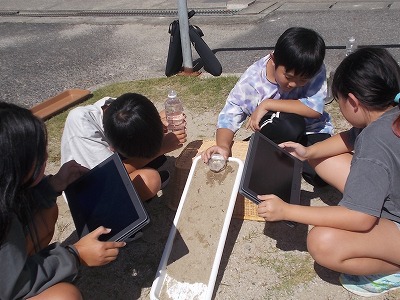 5年生は理科「流れる水と土地」の学習です。トレイに乗せた砂の上に水を流し、砂の削られ方を調べました。各班で動画を撮影しておき、後からゆっくり確認できるようにしました。