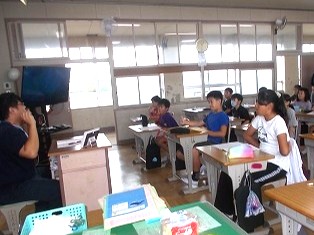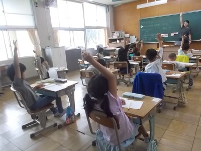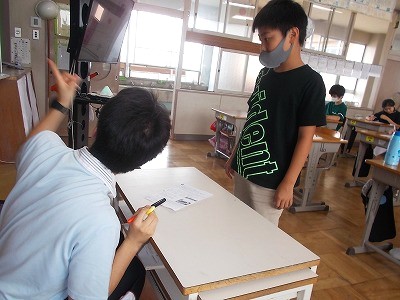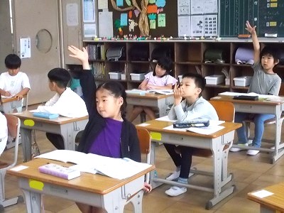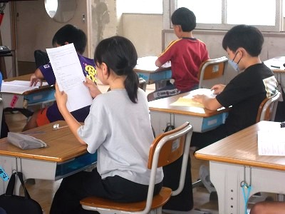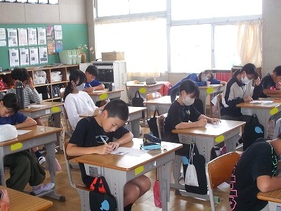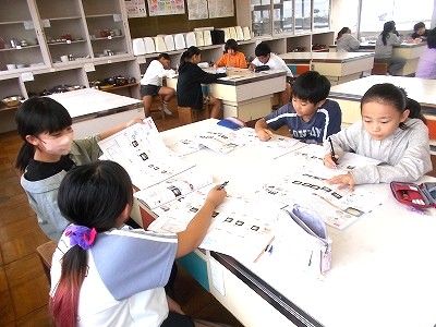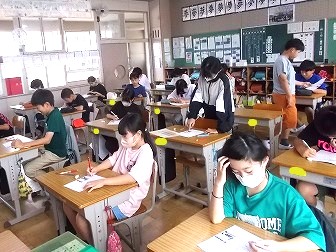 4年生は国語の学習です。シナリオをみんなで見て、変えた方が良いところや、さらにできそうな工夫などを出し合い、しっかりとメモを取っていました。