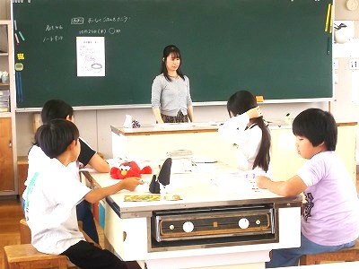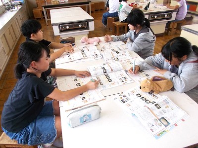 5年生は家庭科で「おいしくごはんをたこう」の学習をしました。家庭科室で班ごとに座り、道具や作り方の確認をしています。
