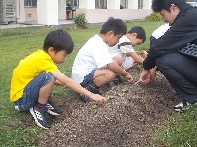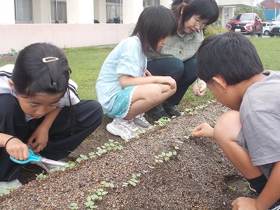 2年生は生活科です。先日蒔いた種からたくさんの芽が出てきました。今日は1本1本丁寧に間引きをしました。大きく育つように、頑張ってお世話をしましょう。