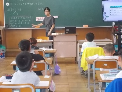 1年生は算数で、「7+4」「6+7」のようなたし算について学習しました。「7はあと3で10になるから、4を3と1に分けて・・・」と、みんなで計算の仕方を考えています。