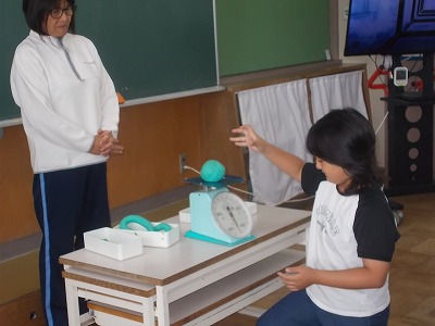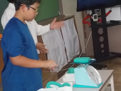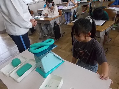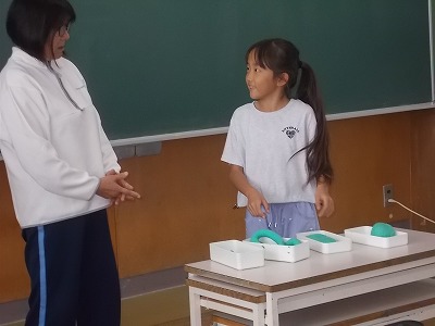 3年生は算数「重さの計算」の学習をしています。「重さの計算のしかたを考えよう」が今日のめあてです。まずは3種類の粘土の重さをはかりで量ってみました。「1㎏」「950g」のように教科書に載った数字を見ているだけよりも、実際にものを触りながらだと、楽しく学習できますね。