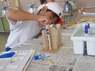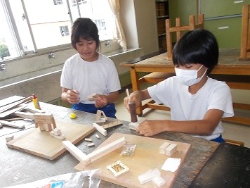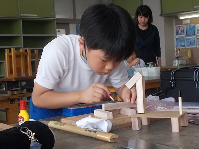 4年生は図工「のこぎりギコギコ」の作品作りです。部品の切り分けが終わって、くぎ打ち、ボンドでの接着、色塗りなどの作業に入りました。少しずつ形ができあがってきて、モチベーションが上がります!