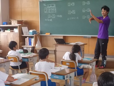 2年生は算数「九九づくり」の学習です。縦横9個ずつ⚫が並んだ図を使って、先生が「5×7」と言ったら、縦5個、横7個の⚫だけが見えるようにノートなどで隠します。かける数、かけられる数をしっかり区別して、考えられるようになりました。
