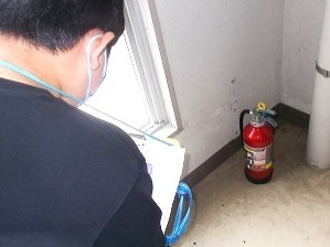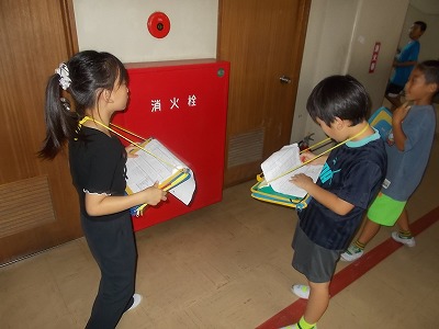 3年生は、社会科で、学校にはどんな防火設備があるかを調べました。「こんなとこにあった!」「これかな?」「こっちにもあるかな?」など、いろいろな声が聞こえてきました。