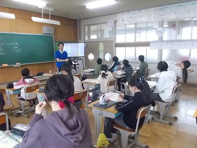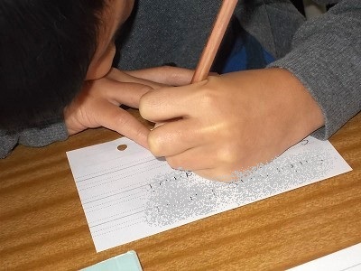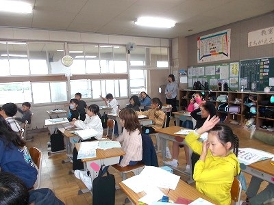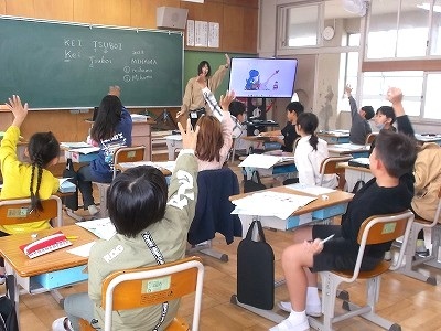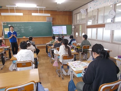 4年生は英語の授業で、自分の名前の書き方を練習しました。名字と名前の最初の文字だけ大文字にすることを教わりました。名前のほかにも、「野間」のような地名や「富士山」のような山の名前なども、最初の文字を大文字にすることを教わりました。