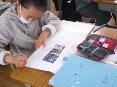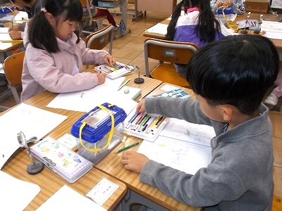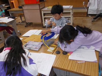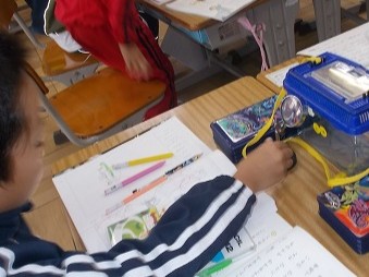 1年生は「くわしくかこう」の学習をしています。虫かごに入れた昆虫を、虫眼鏡も使いながらよく見て記録しました。身を乗り出して、細かいところまで観察していますね。