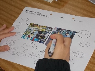 5年生も社会です。中小工場と大工場の写真を見て、気づいたことをプリントに書き込みました。両方に共通する発見を見つけた子もいて、気づきがどんどん広がっていきました。