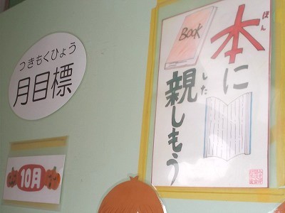 今月の目標は「本に親しもう」です。今日のように外で遊べない日は、「読書の秋」にしてみては?図書室のおすすめ本の棚には、すでにたくさんの代本板がありました。いろいろな本を手に取ってみてください。