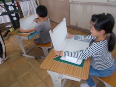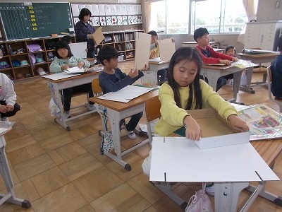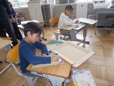 2年生は図工で「ともだちハウス」の学習に入りました。教材のセットが配られて、子どもたちは早く作りたくて仕方がない様子でした。どんな形の家にするのかを考えて、まずは家になる箱の組み立てを行いました。
