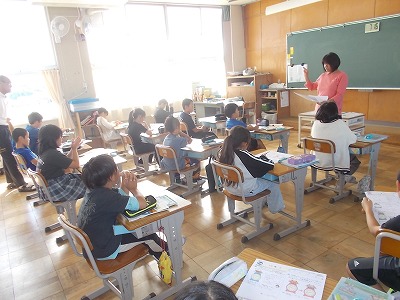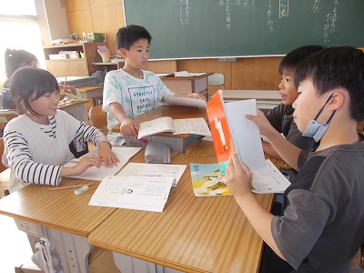 4年生は国語「クラスみんなできめるには」の学習をしています。「クラスのお楽しみ会ですことを1つだけ決める」という設定で、話し合っています。やりたいことを挙げて、メリットやデメリットなど、いろいろな意見を出して話し合っていました。