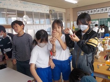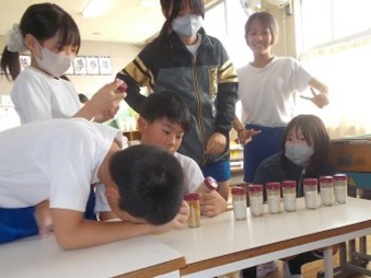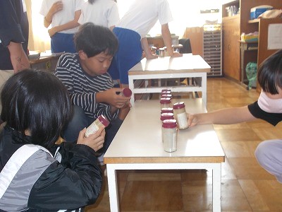 6年生は理科「土地のようす」の学習です。先生が謎の瓶を取り出しました。これは昭和63年に野間小体育館建設に先立ち、ボーリング調査を行ったときの土や砂のサンプルです。深さごとに分けられていて、野間小の地面はどのような層になっているかがわかります。子どもたちは興味津々。地層の学習が楽しみになりましたね。