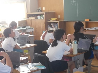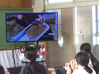 5年生は理科「流れる水と土地」の学習です。前に水を流す実験を行いましたが、そのときに撮った動画を大型モニターや個人の学習者端末でみながら振り返り、まとめていきました。