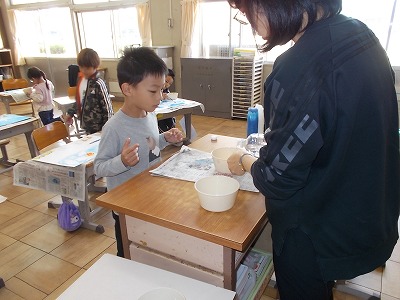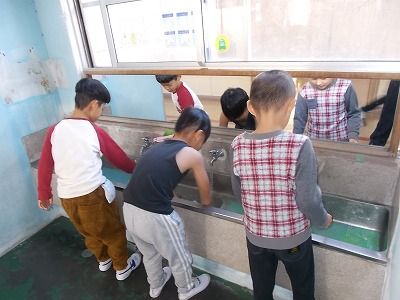 1年生は読書感想画の色塗りです。先生に絵の具をもらって、色塗りの続きを丁寧に行いました。廊下の手洗い場では、周りを汚さないように気をつけながら、筆や絵の具を入れた皿をきれいに洗っていました。