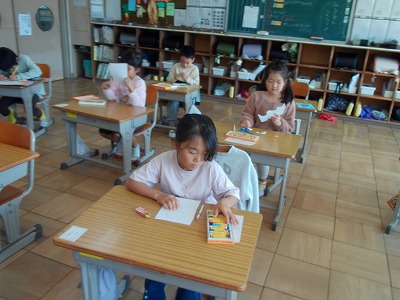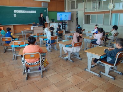 2週間前から外国語活動の授業がはじまりました。初めて習う英語に、子どもたちは興味津々です。今日は、数字、天気、物の渡し方を習いました。