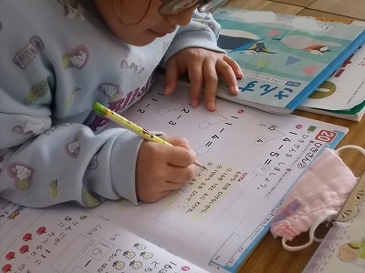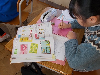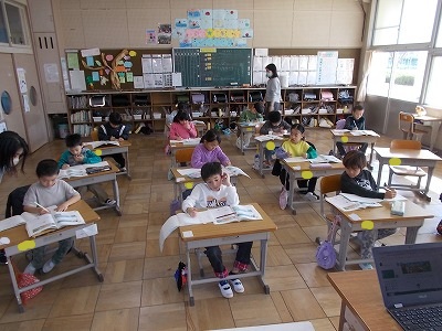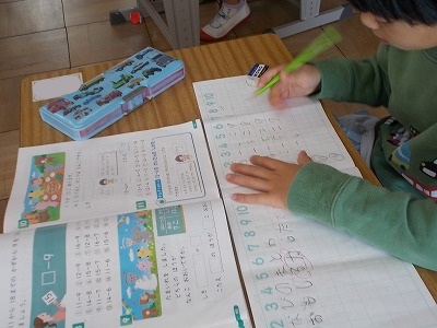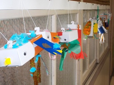 1年生はひき算の計算問題を解いています。慌てず正しく計算ができるようになってきましたね。廊下には、図工の作品が展示されていました。たくさんの作品が一列に吊り下げられていて、とてもかわいいですね。