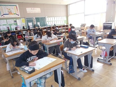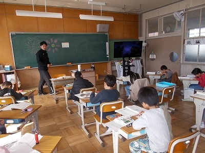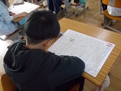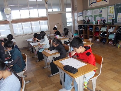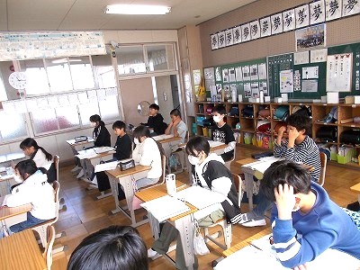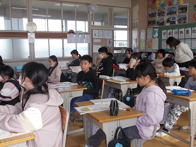 4年生は国語「未来につなぐ工芸品」のテスト中でした。廊下には、工芸品について調べてまとめたパンフレットが展示されていました。