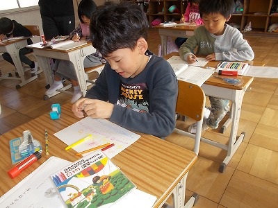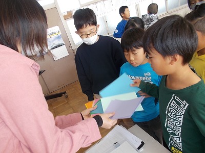 3年生は英語の授業で、〇・△・▢の英語での言い方や、赤・青・紫・黄緑など色の言い方を確認しました。後半は好きな色の色画用紙をもらい、バースデーカードやクリスマスカードなど、英語を使ったカード作りをしました。