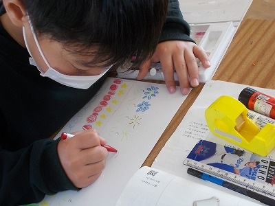 2年生は国語「紙コップ花火の作り方」の学習をしています。今日は紙に花火の絵を描いています。カラフルな色、いろいろな形で、花火を表現しました。