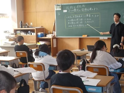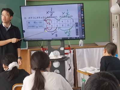 6年生は算数「比例と反比例」の学習をしています。「比例」とはどんなことなのか、先生の解説を聞きながら、みんなでじっくり考えています。