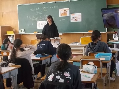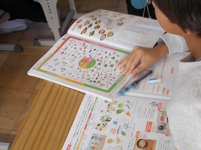 5年生は家庭科「食べて元気!ご飯とみそ汁」の学習です。いろいろな食品を、3つの働き「エネルギーになる」「体をつくる」「体の調子を整える」のどれに当てはまるか考えました。