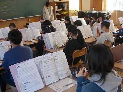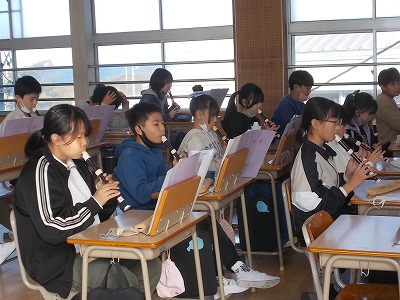 6年生は音楽の授業です。リコーダーで「ウェンセスラスはよい王様」というイギリスの曲を練習しました。みんながきれいな音で吹けるように、少し曲のテンポを遅くして練習しています。