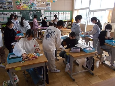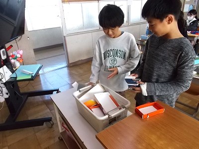 5年生は家庭科「物を生かして住みやすく」の学習で、自分の道具箱をより使いやすくする工夫を考えました。道具箱には何を入れるかを確かめた上で、空き箱で仕切りを作るなどの工夫をしました。