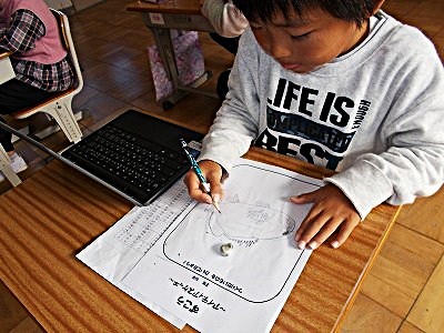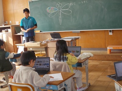 2年生は図工「光のプレゼント」で作る作品のアイデアスケッチをしていました。光を通すようなデザインにすることを頭に置いて考えています。先生が見本で黒板に描いたトンボもすてきですね。