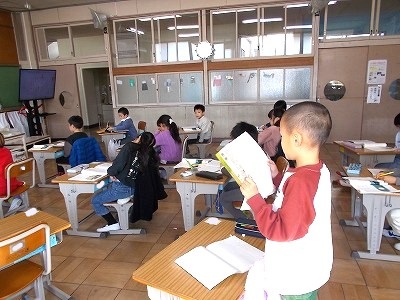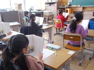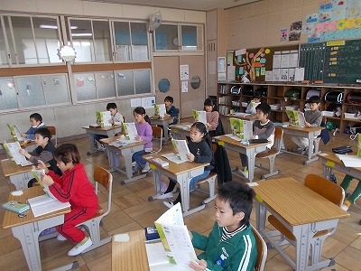 1年生の国語は、「たぬきの糸車」というお話に入りました。みんなで声を出して読んでいます。教科書を手に持って、よい姿勢で読めていますね。すらすらと読めるようになってきました。