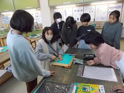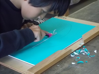 5年生は図工「掘り進めて刷り重ねて」の学習に入りました。彫刻刀の種類や使い方について先生から説明を受け、いよいよ掘り始めました。