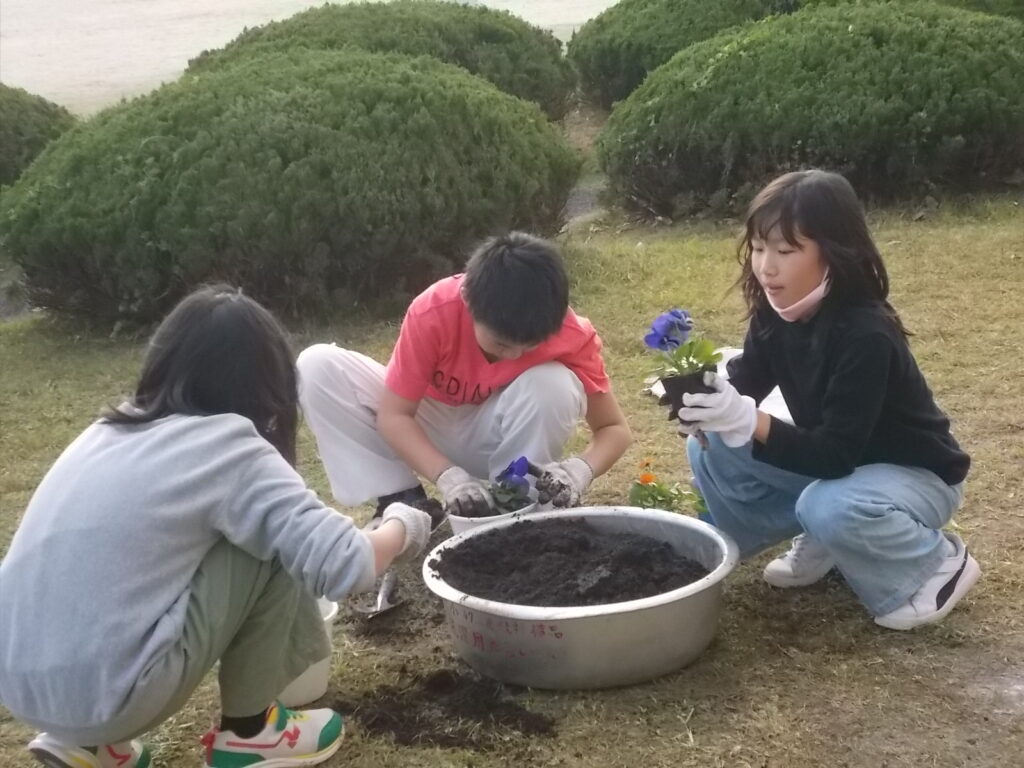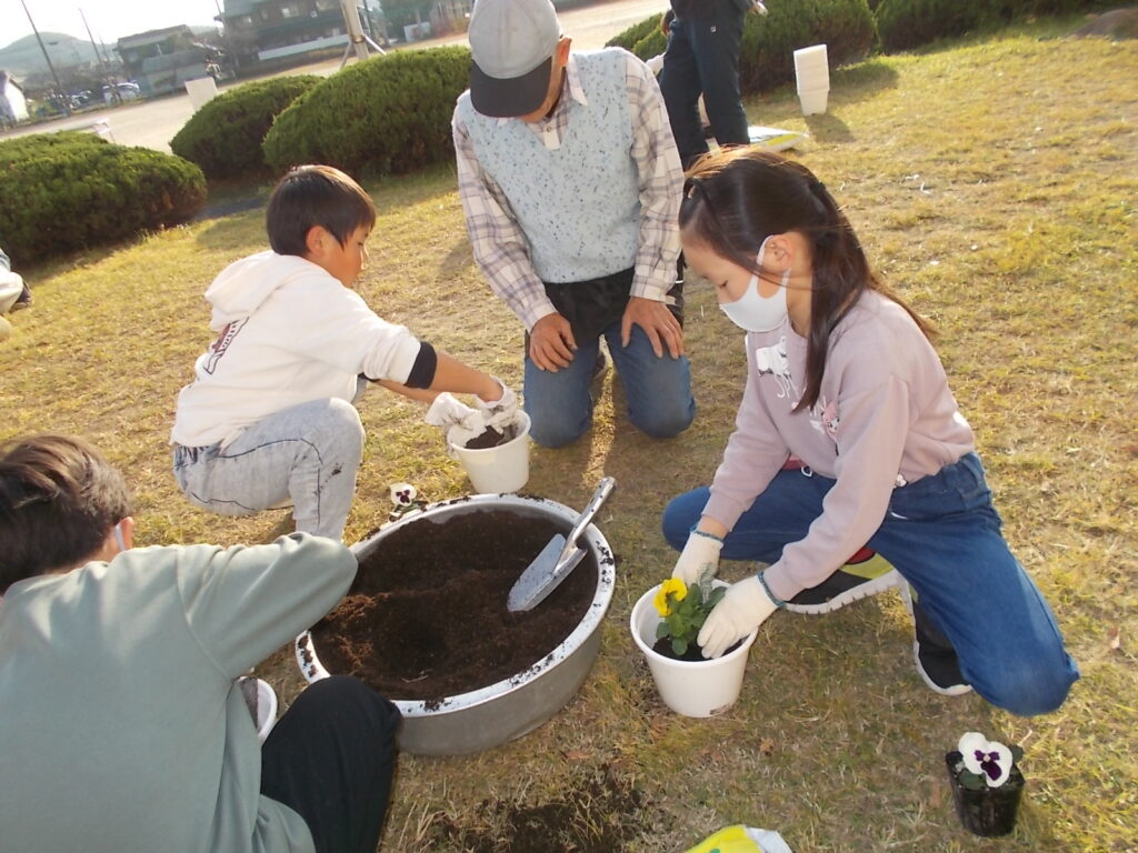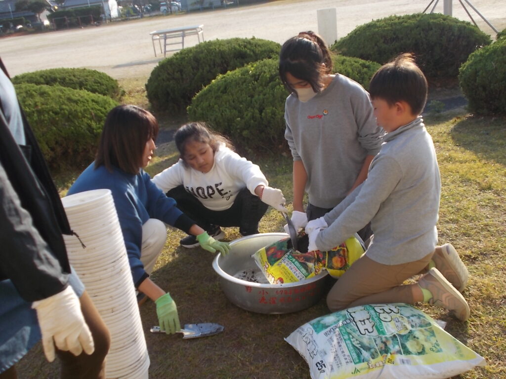 今日は、農家の方に来ていただいて、卒業式に飾る花を植えました。4年生の児童は意欲的に活動して、45分間で114鉢を作ることができました。
