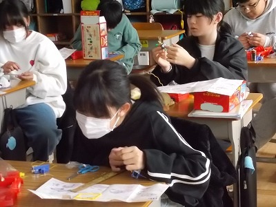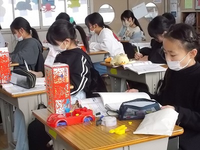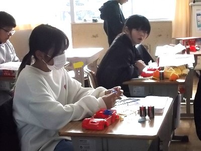 5年生は理科「電流が生み出す力」の学習です。乾電池の数やコイルの巻き数を変えたときの違いをまとめたあと、次の実験に向けて、キットの組み立てを行いました。なかなか難しい組み立てで、TTの先生や校長先生もお手伝いしていました。