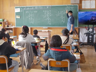4年生は算数で、小数の割り算の問題練習に挑戦しました。小数点の位置や、小数点以下の最後の桁が0の場合の処理など、注意点を意識しながら解きました。
