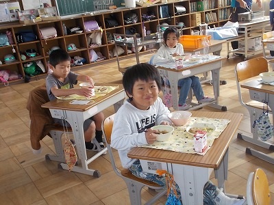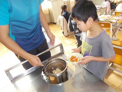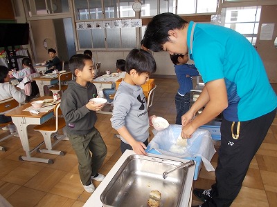 2年生の給食の時間です。たくさん食べたい子は先生におかずを増やしてもらいました。自分が食べられる量を考えて、無理なく、おいしく食べていました。