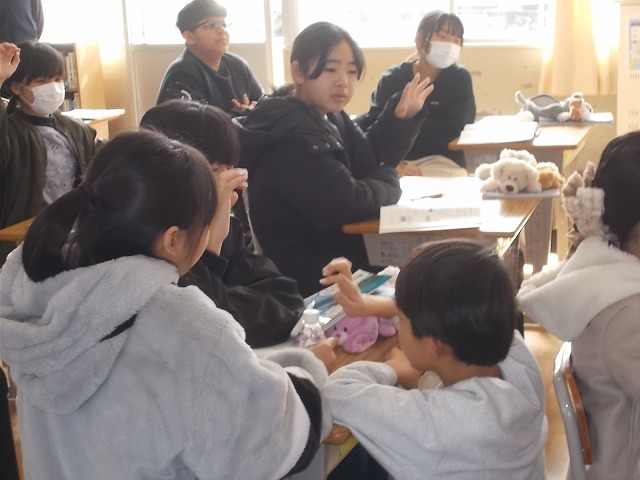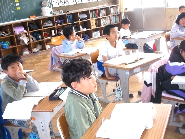 2年生は国語「詩の楽しみ方を見つけよう」の学習です。教科書の「おとのはなびら」という詩をみんなで読みました。「音のはなびらって、どういうこと?」というつぶやきがあり、まずはみんなで「音」にはどんなものがあるかを出し合いました。