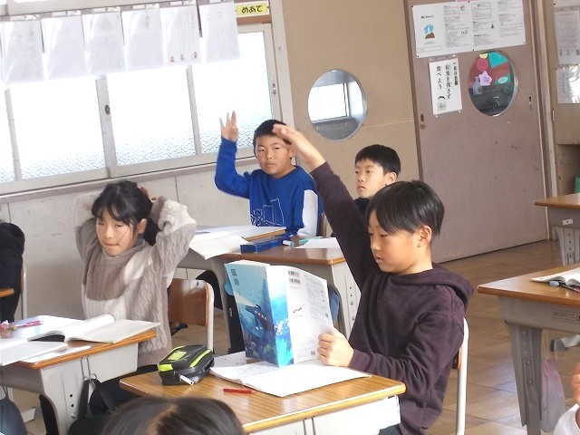 3年生も国語「詩の工夫をたのしもう」という、詩の単元でした。教科書の詩を読んで、どんな工夫が隠されているかをみんなで考えました。一つ目の詩は、各行の最初の文字をつなげると「か・た・つ・む・り」となっていました。