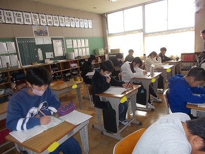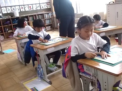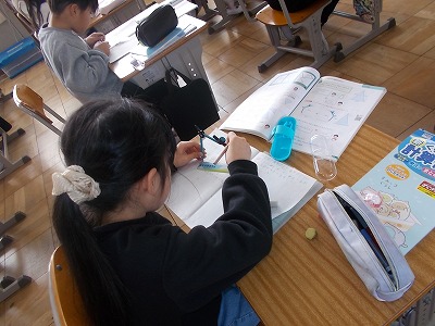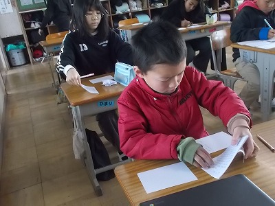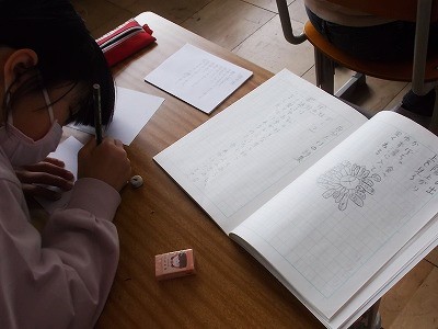 4年生は国語の詩集づくりを進めています。気に入った詩を様子に書いています。用紙を綴じるときののりしろになるスペースも考えなから、1枚1枚丁寧に書いていました。