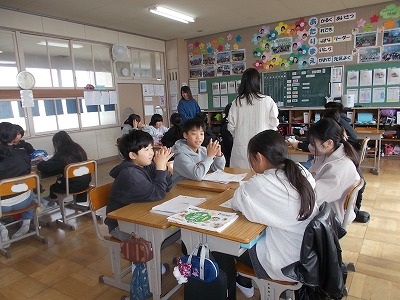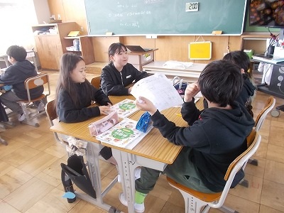 5年生は家庭科の学習で印象に残っていることを絵日記風に表し、グループごとに発表し合いました。この後、グループの代表がみんなの前で発表するようです。