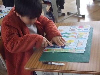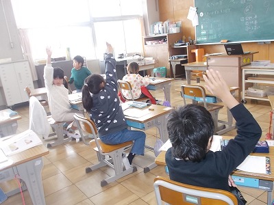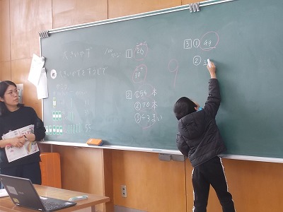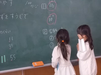 1年生は算数は「大きいかずをすうじでかこう」が今日のめあてです。「十の位が4、一の位が9の数は?」など、先生や友達が言った数をすらすらと表せるようになりました。