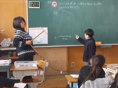 3年生は算数で、コンパスを使った二等辺三角形や正三角形のかき方について考えました。みんなで意見を出し合いながら考えていきました。