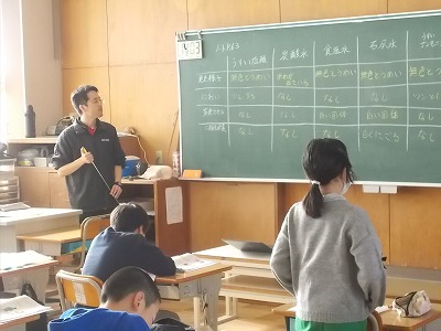 6年生は理科「水溶液」の学習で、薄い塩酸、食塩水、薄いアンモニア水など5種類の水溶液について、見た様子、におい、蒸発させた様子、二酸化炭素に触れさせたときの様子、という観点で、性質を比べました。