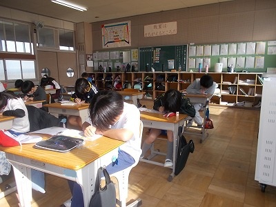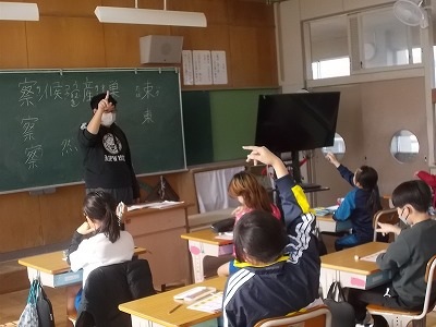 4年生の国語の授業では、最初に新出漢字の学習をしました。先生と一緒に空書きをして書き順や形を確認した後、ドリルに書き込んで練習しました。