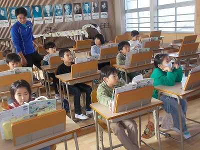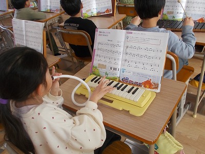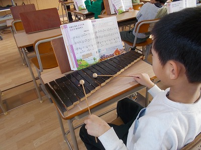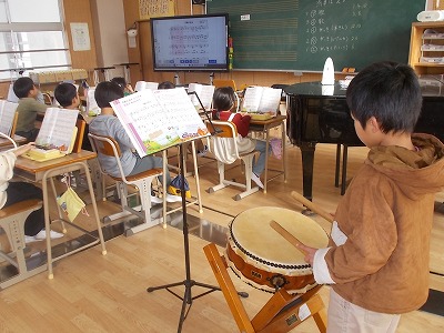 2年生は音楽で、「汽車は走る」という曲を学習しています。歌、鍵盤ハーモニカ、木琴、太鼓、の4つを分担して演奏しました。