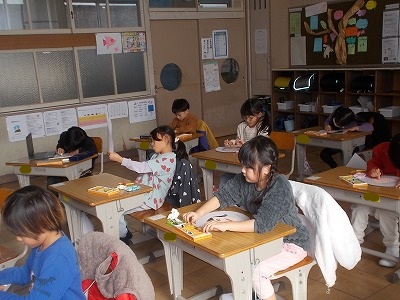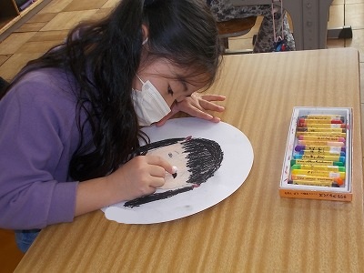 1年生は似顔絵を描いていました。丸い用紙に大きく丁寧に描いています。そっくりに描けましたね!