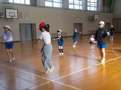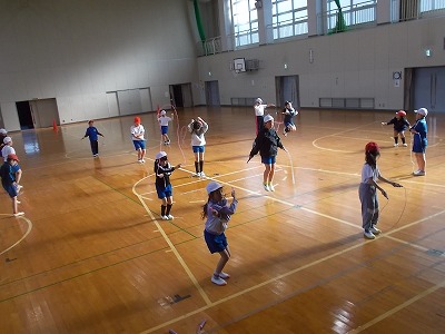 3年生の体育は、縄跳びでした。調子よく跳べている子もいれば、引っかかってしまい悔しがっている子もいました。自分の目標の跳び方、目標の回数に向けて、どの子も頑張っています。
